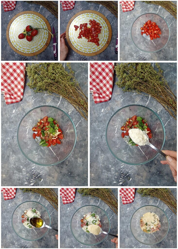 Voeg het vruchtvlees van de aubergines toe aan de kom met de cherrytomaatjes en meng de ingrediënten.