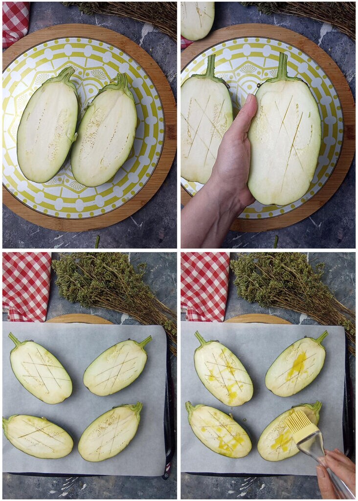 Om de Gevulde aubergines met cherrytomaatjes te maken, wassen we eerst de aubergines, snijden ze doormidden en maken inkepingen aan de oppervlakte.