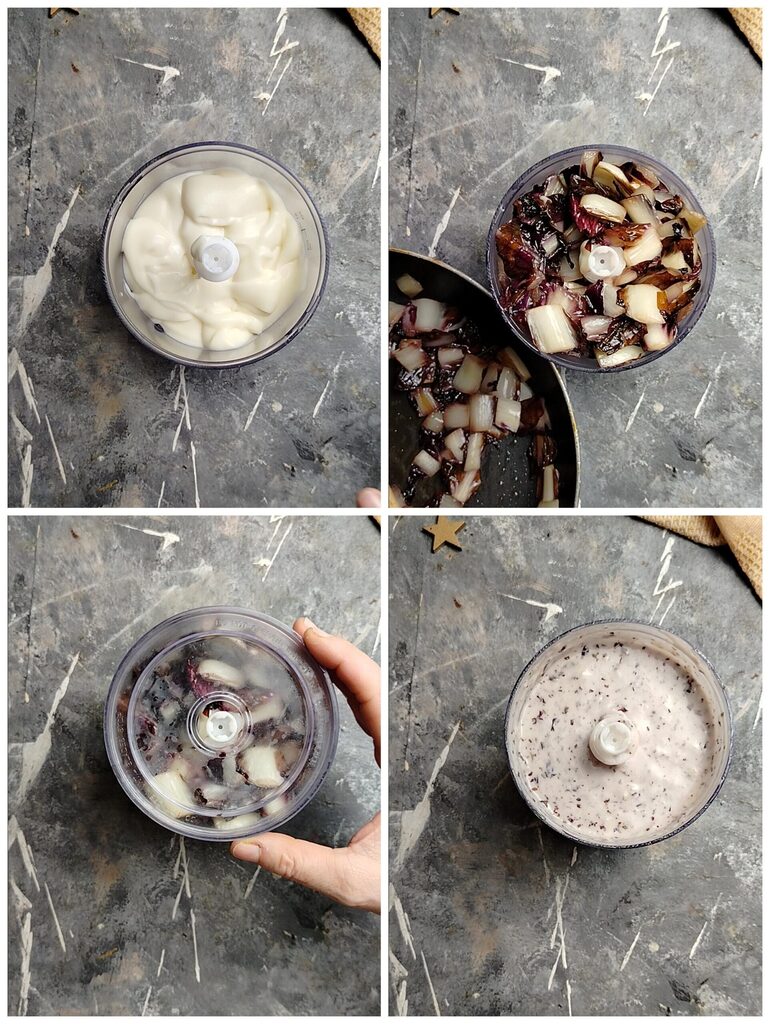 Snijd de radicchio in vrij dunne reepjes, verwijder de stronk en kook het in een koekenpan gedurende 12 minuten met olie en zout, op een laag vuur en regelmatig roeren.