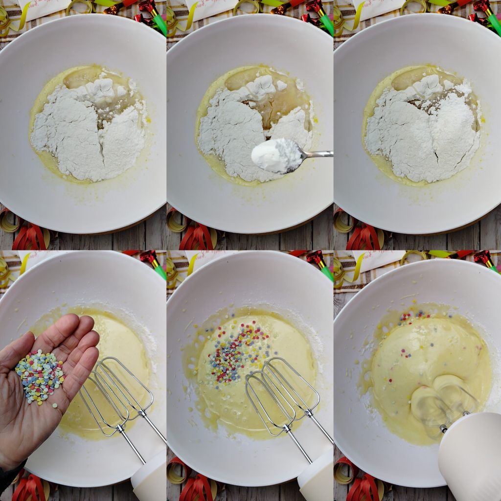 Voeg het rijstmeel, de zonnebloemolie en de theelepel glutenvrij bakpoeder toe. Blijf mengen met de elektrische garde. Ik heb wat gekleurde hagelslag aan het beslag toegevoegd, maar je kunt dit overslaan als je niet zeker weet of ze glutenvrij zijn.