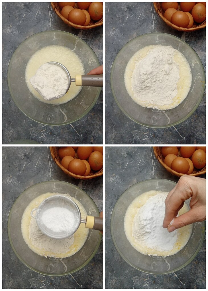 Voeg de gezeefde bloem, het bakpoeder en een snufje fijn zout toe.
