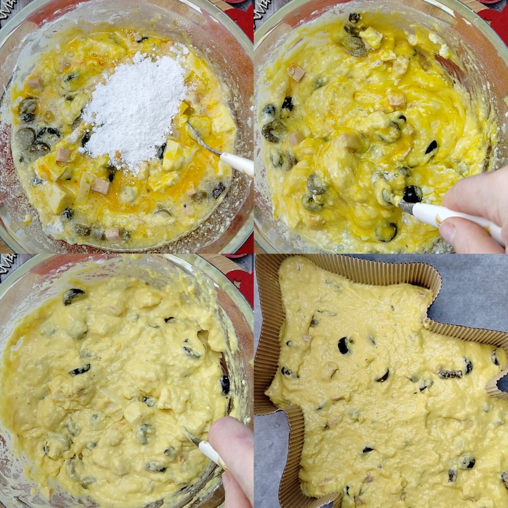 • Voeg het zout, de saffraanpoeder en de in blokjes gesneden kaas toe. Voeg de in blokjes gesneden gekookte ham en de in ringen gesneden ontpitte olijven toe. Kneed snel.