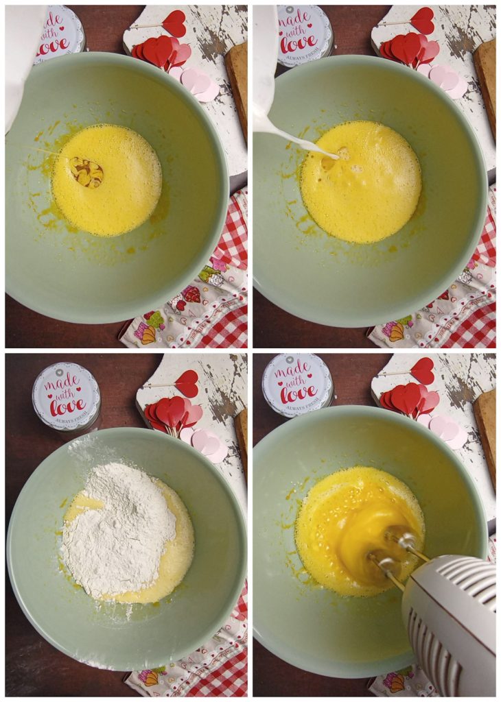 Voeg dan de zonnebloemolie, de melk toe en meng de ingrediënten steeds met de elektrische garde.