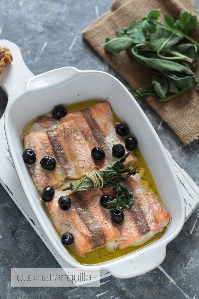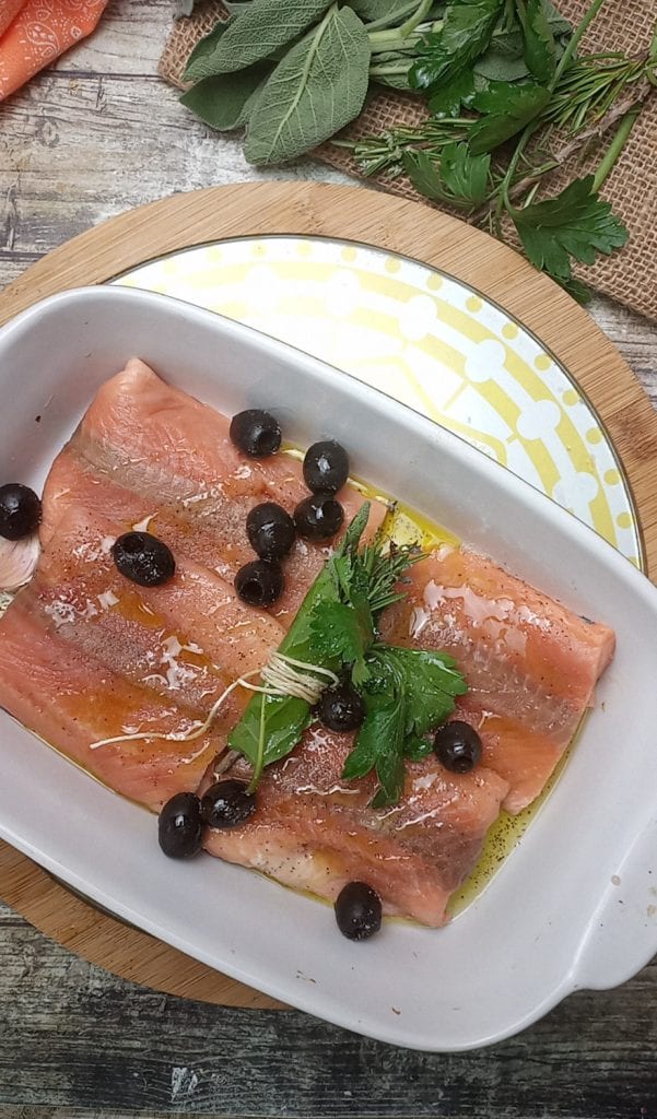 In de oven gemarineerde zalm met aromatische kruiden