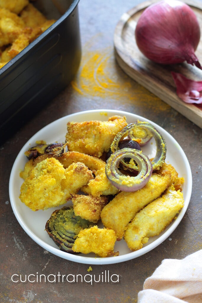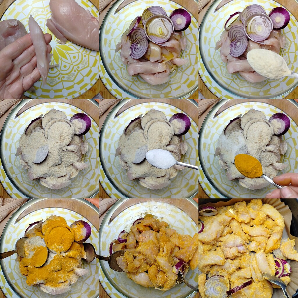 Om de kalkoenfilets met kurkuma in de airfryer te maken, snijd je de kipfilet in filets en de rode ui, zonder schil, in halve centimeter dikke ringen.