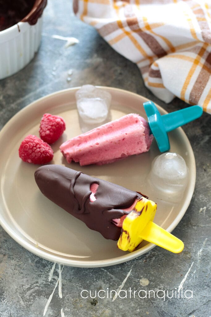 Kefir-yoghurtijs met frambozen, een heerlijk idee dat heel gemakkelijk te maken is en in een halve dag klaar is. Hier is mijn recept met een kleine tip om te delen: vries de frambozen de dag ervoor in om de bereiding van dit heerlijke ijs te versnellen. In dit recept wordt ook het gebruik van een lepel gecondenseerde melk aanbevolen om meer stevigheid te geven aan het eindresultaat. Je kunt het ook weglaten als je het niet lekker vindt, of een lepel poedersuiker toevoegen wanneer je de frambozen en de yoghurt samen in de mixer doet. Je kunt het ijs gewoon zo eten of bedekken met een heerlijke laag van je favoriete gesmolten chocolade. Ik heb ervoor gekozen om 50 g pure chocolade in de magnetron te smelten, maar je kunt de techniek gebruiken die je het prettigst vindt. In het recept leg ik uit hoe je een coating maakt zonder gedoe.