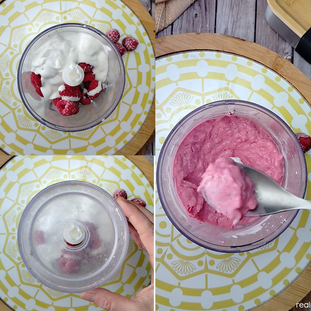 • Om het kefir-yoghurtijs met frambozen te maken, gebruik je eerst de gewassen, goed gedroogde en minimaal 3 uur ingevroren frambozen zoals voorgesteld in de inleiding. Doe ze in de mixer en voeg de lepel gecondenseerde melk toe.
