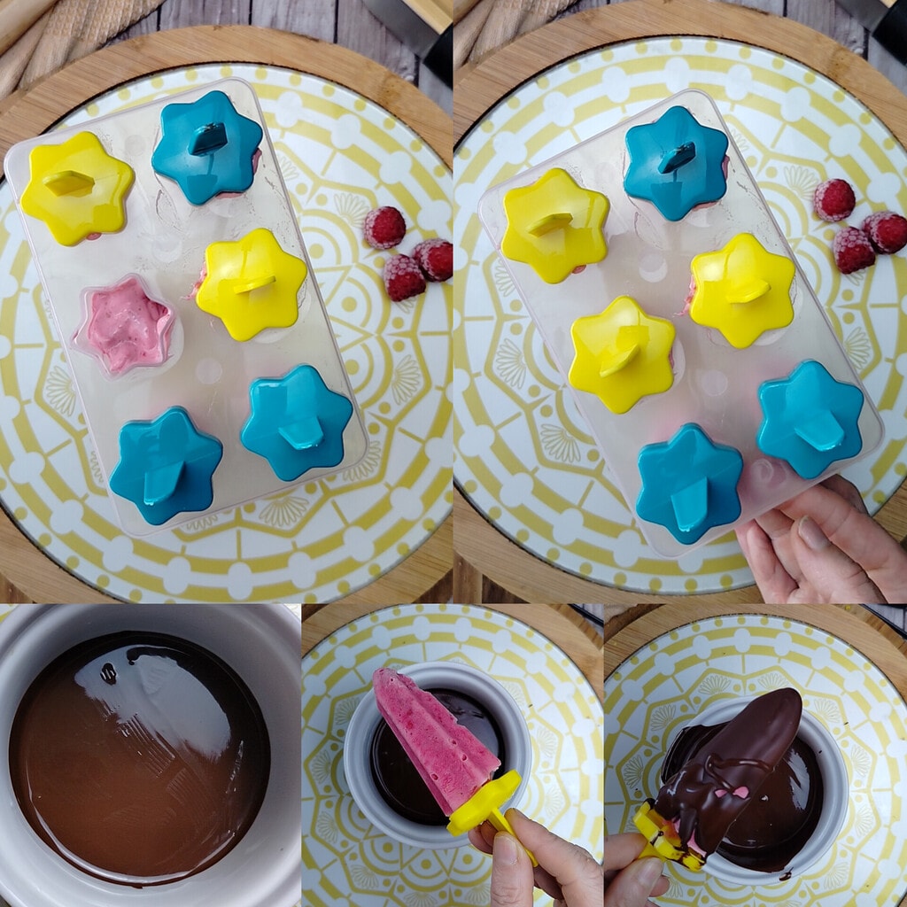 • Ik vond alleen deze vormpjes, die niet de meest praktische zijn. Eigenlijk raad ik de siliconen met bijgeleverde stokjes aan, die veel praktischer zijn en de link staat tussen de gereedschappen. Zodra de crème klaar is, giet je deze in de daarvoor bestemde vormen, vul ze volledig en steek het stokje erin. Zet in de vriezer tot het ijs gestabiliseerd is. Meestal duurt dit 6 tot 9 uur. Als het product klaar is, kan je het zo eten of bedekken met een laag van je favoriete chocolade. Ik heb 50 g pure chocolade in de magnetron gesmolten in 2 minuten en mijn ijsjes ermee bedekt.