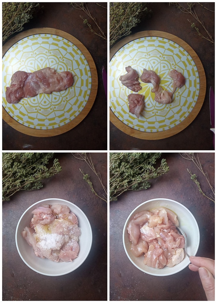 Om de kip- en groentespiesjes uit de oven te bereiden, snijden we eerst elke kipdij in zes vergelijkbare blokjes.