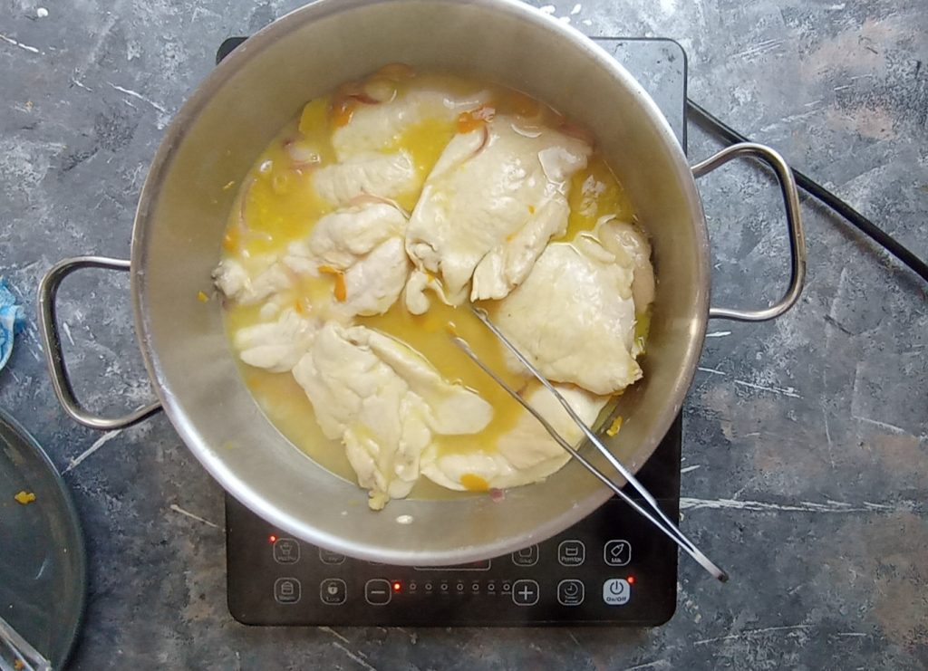 Kipfilet met citrusvruchten, met rode ui, een snel, gemakkelijk en heerlijk recept.