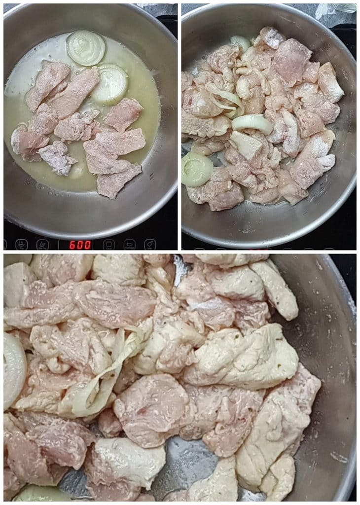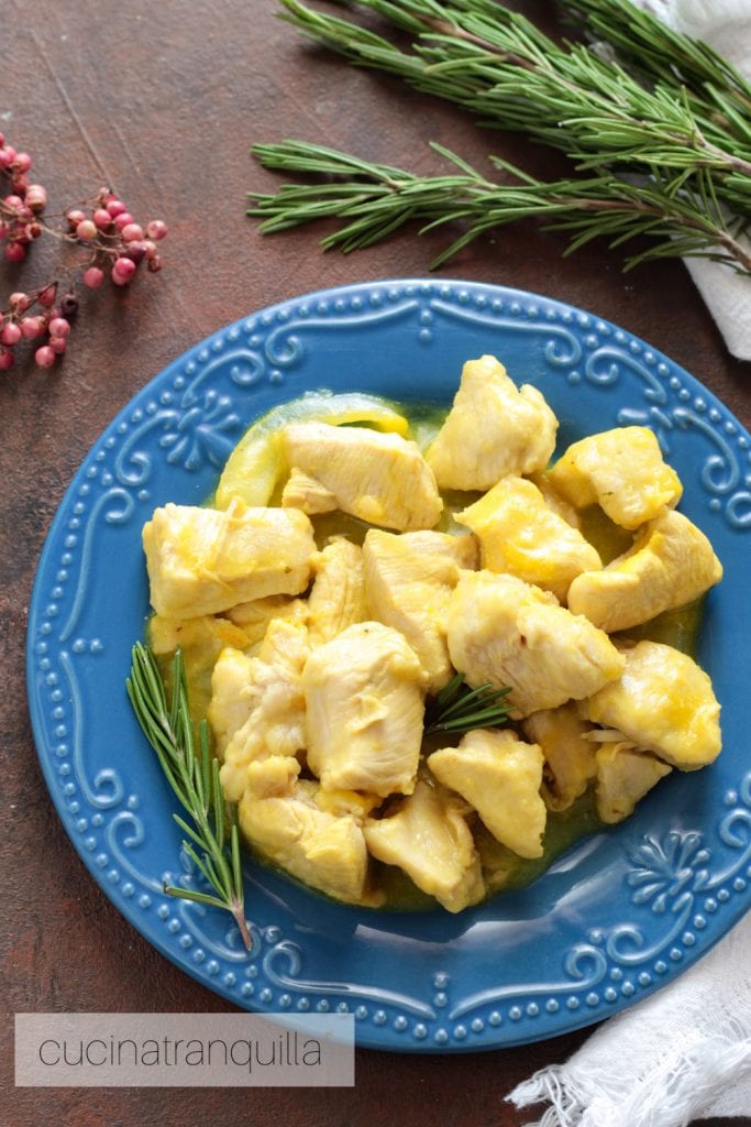 Kipstukjes met schuimwijn en saffraan, een recept voor een hoofdgerecht klaar in 30 minuten.