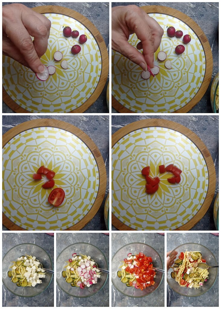 Deze keer heb ik letterlijk dit recept gemaakt met wat ik in de koelkast had, namelijk een half blokje feta en een courgette, wat cherrytomaten samen met radijsjes om kleur toe te voegen en klaar.