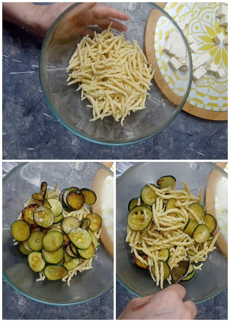 Voeg alle ingrediënten toe aan de pasta en courgettes in de kom.