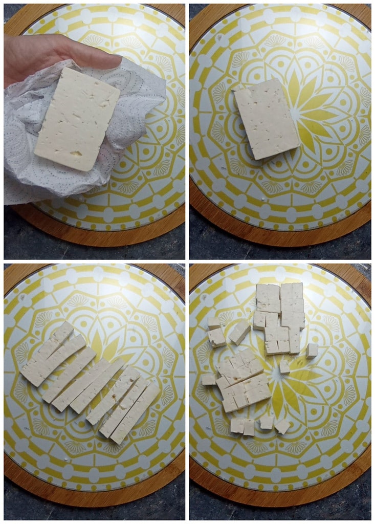 Snijd het eerst in staafjes en daarna in kleine blokjes.
