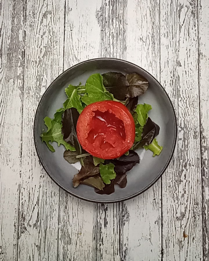 We vullen de tomaat met wat salade en voegen twee eetlepels linzen toe.