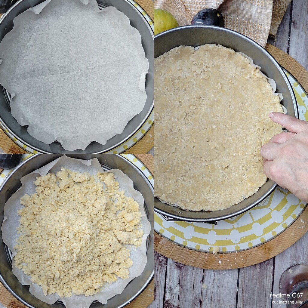Om de kruimeltaart met verse vijgen en bosvruchtenjam te maken, werk je eerst in een kom met een vork en vervolgens met de hand de bloem, eieren, suiker, verzachte boter, een snufje zout en een beetje bakpoeder. Verwerk snel alle ingrediënten tot een zacht maar korrelig beslag.