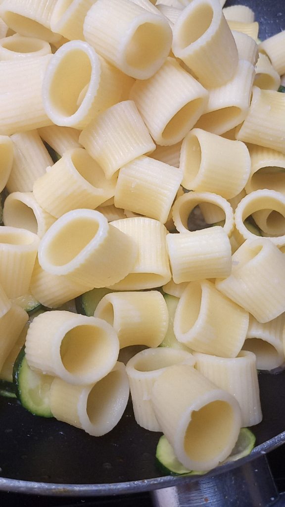 Mezze maniche met garnalen en courgettes, een fris en smakelijk hoofdgerecht, perfect in elk seizoen, geweldig in de zomer.