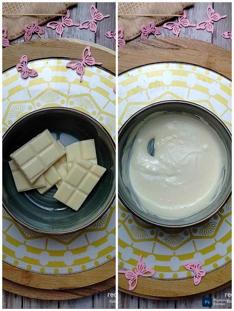 Voeg de gesmolten witte chocolade toe, meng goed en laat 30 minuten rusten in de koelkast nadat je de kom hebt afgedekt met plasticfolie.
