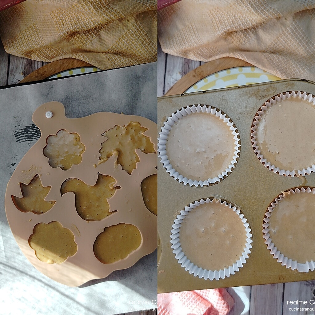 • Je kunt de vorm gebruiken die ik bij het gereedschap heb aangegeven, of de klassieke muffinvorm, bekleed met papieren vormpjes. In beide gevallen moet de ruimte tot driekwart van de capaciteit worden gevuld.