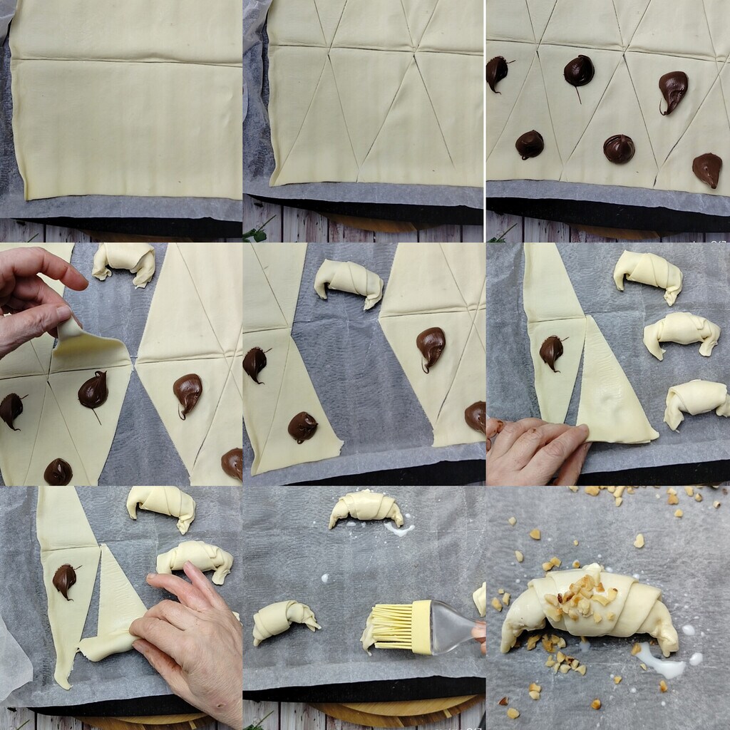 Om deze croissants nog smakelijker en lekkerder te maken, heb ik een rechthoekig bladerdeeg gebruikt dat in tweeën is gesneden en aan elkaar is gekoppeld. Daarnaast heb ik krokante hazelnootstukjes gebruikt om onze lekkernijen te decoreren. Als alternatief kun je ook pistachenootjes gebruiken om een lichte smaakcontrast te creëren.