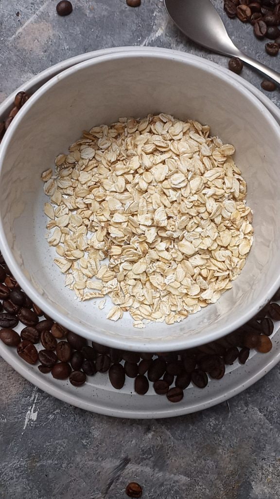 Om een overnight pap met verse en heerlijke koffiyoghurt te maken, giet eerst de havervlokken in een kom en voeg de melk toe.