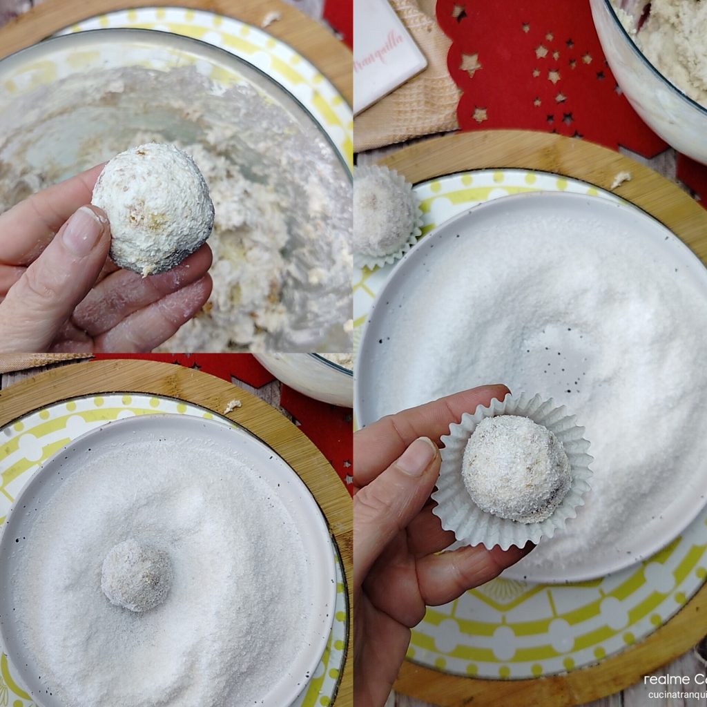 • Na deze tijd haal je de kom tevoorschijn en vorm je balletjes ter grootte van een walnoot. Rol ze vervolgens door de kokos en plaats ze in de papieren vormpjes.