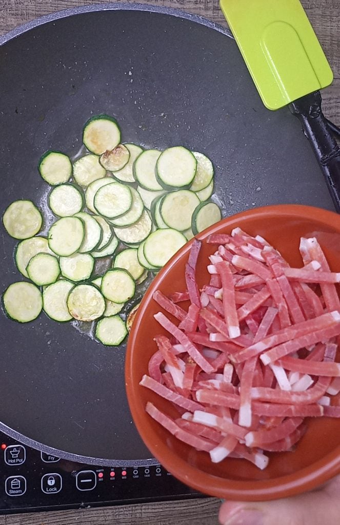 Voor een romiger eindresultaat kun je de courgettes raspen, ze uitknijpen en direct in de pan bakken met het spek.