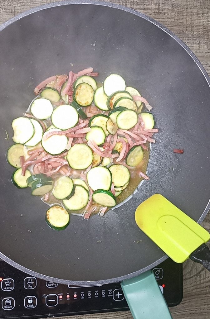 • Voeg de courgettes toe aan de knoflook en bak 5 minuten goed, af en toe roerend.