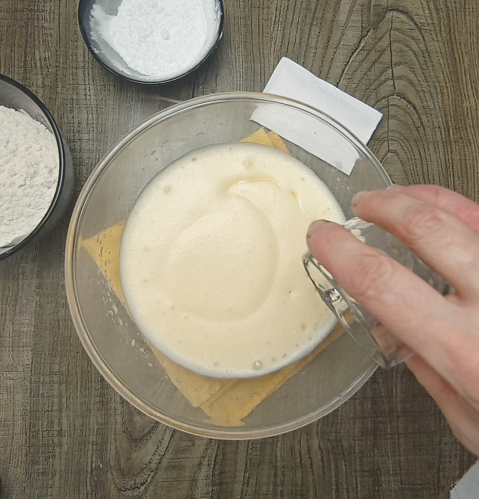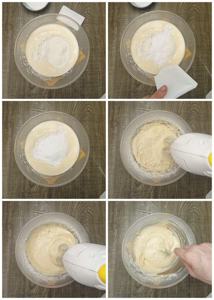 • Voeg nu de resterende poeders toe, de bloem, het bakpoeder en het aardappelzetmeel.