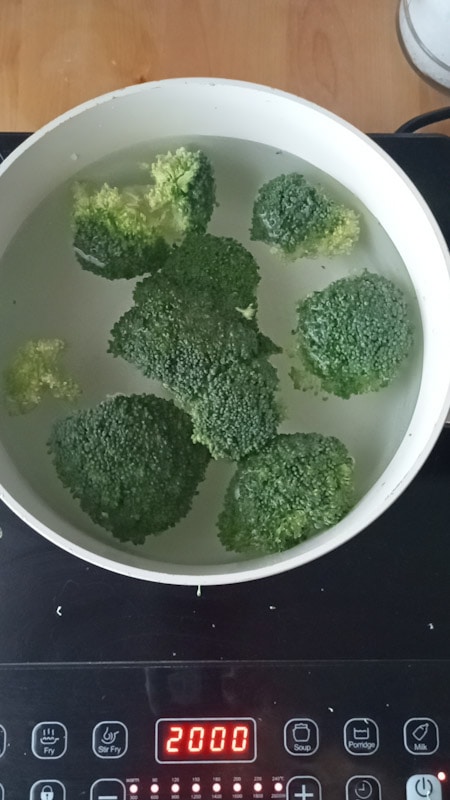 Zet twee soeplepels van het hete kookwater van de broccoli opzij.