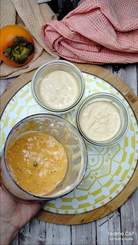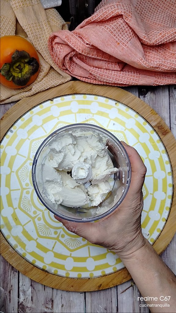 Bij dit recept is het essentieel om een vrij zacht en romig ingrediënt te gebruiken. De appelkaki, die harder is, is niet bijzonder geschikt voor gebruik in dit idee. Hieronder zie je de romigheid ervan na rust.