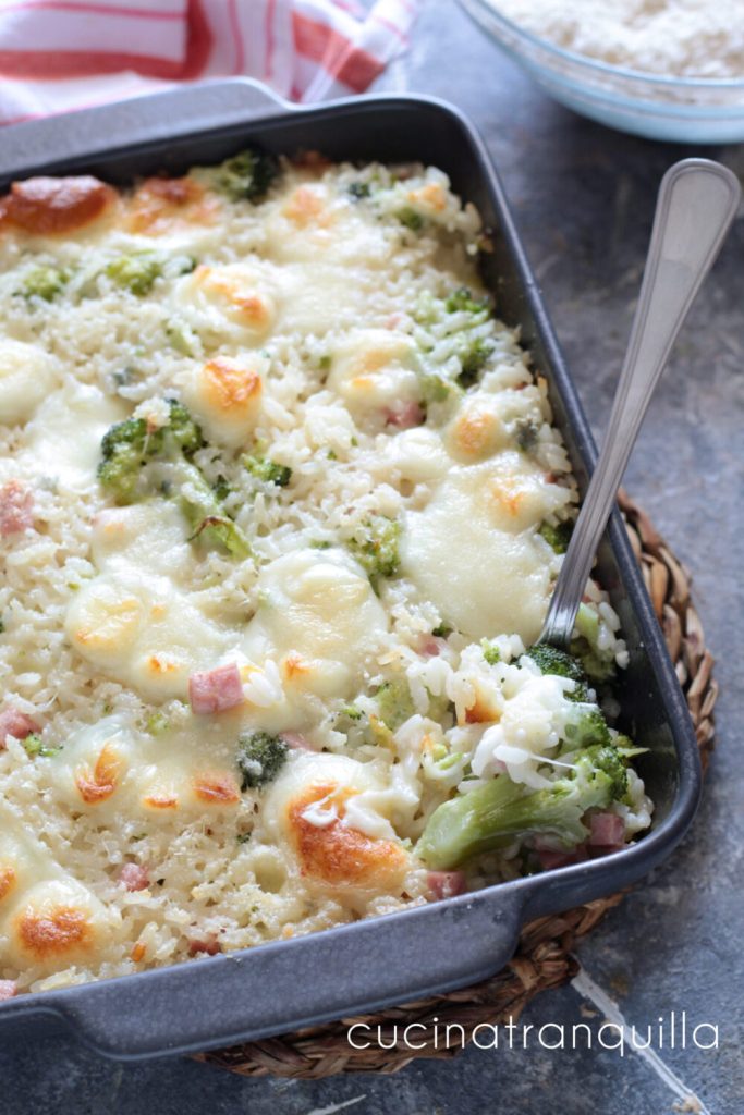Rijst uit de oven met kazen, broccoli en gekookte ham