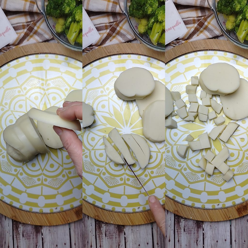 • Doe in de kom met de rijst de gorgonzola-mascarponecrème en voeg de helft van de geraspte kaas en de helft van de blokjes scamorza toe. Voeg vervolgens de broccoli en de gekookte ham toe en meng alles goed door elkaar.