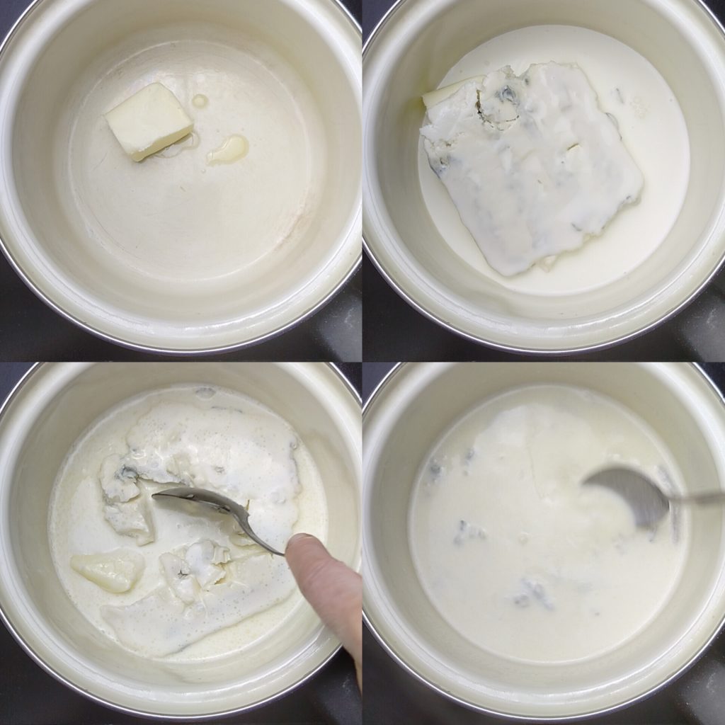 • Smelt in een steelpannetje de boter en voeg de gorgonzola en mascarpone met de melk toe. Roer tot alles gesmolten is en je een romige saus krijgt.