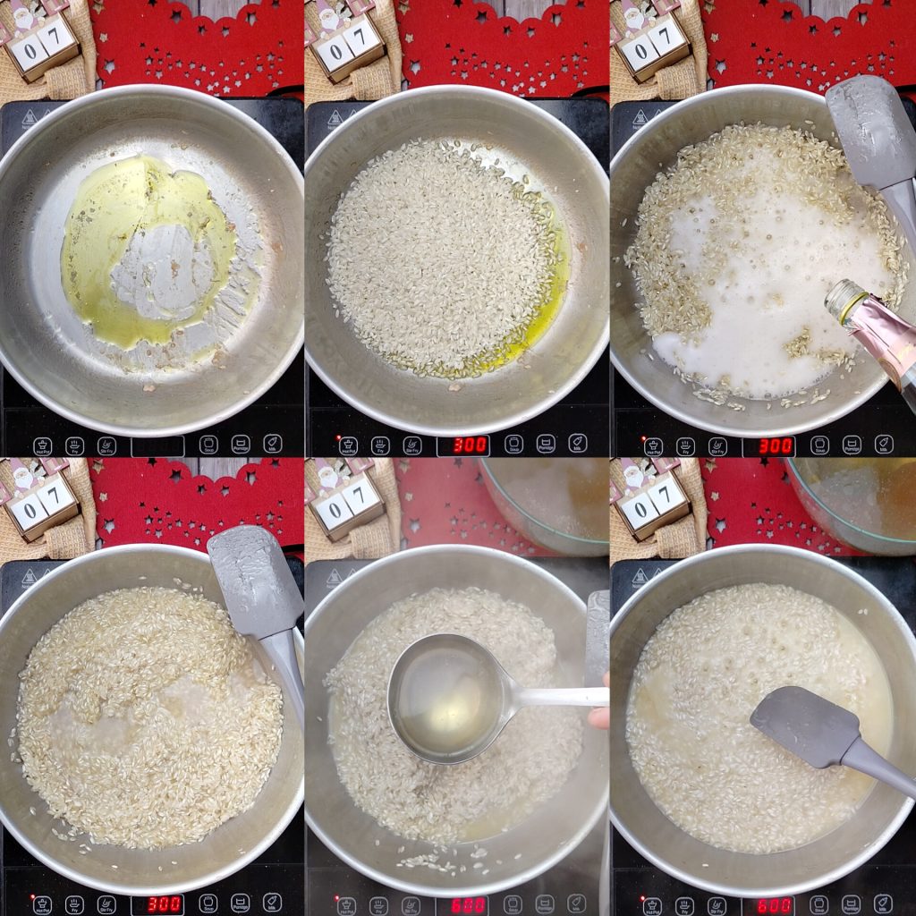 In de braadpan verwarmt u de olie en voegt u de rijst toe. Rooster deze een minuut en blus af met de prosecco. Zodra het alcoholische deel is verdampt, voegt u een ruime pollepel fumet tegelijk toe, waarbij u de volgende pollepel toevoegt wanneer de vorige volledig is opgenomen.