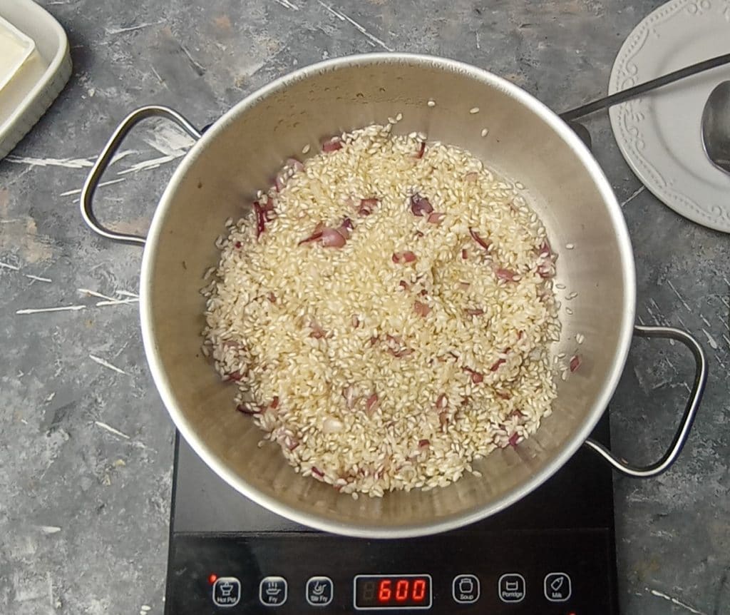 Zodra de bouillon klaar is en alle ingrediënten zijn voorbereid, zijn we klaar om de risotto te maken, met een beetje geduld.
