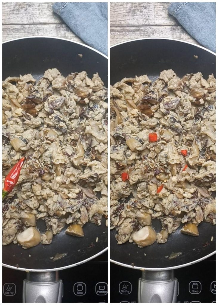 Was de chilipeper en snijd deze in stukjes, voeg nog een eetlepel olie toe, meng en zet het vuur uit.