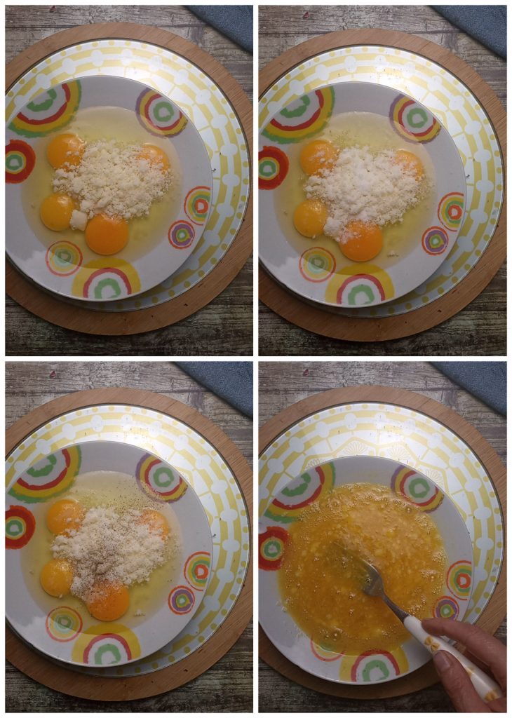 Klop ondertussen de eieren in een kom met een snufje zout en peper en de geraspte kaas tot een homogeen mengsel.