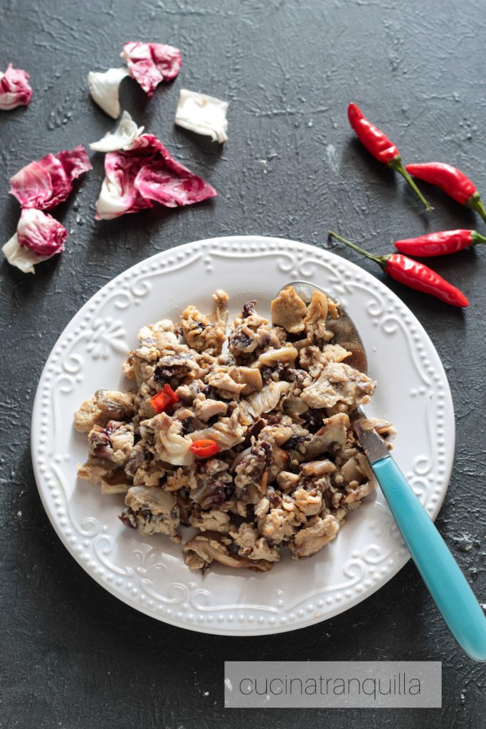 Roerei met radicchio en chilipeper, een eenvoudig en smakelijk recept, perfect ook als vulling.