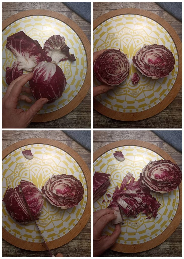 Om de Roerei met radicchio en chilipeper te bereiden, verwijder je eerst de buitenste bladeren van de radicchio, snijd deze eerst doormidden, vervolgens in nog eens twee helften en daarna in reepjes.