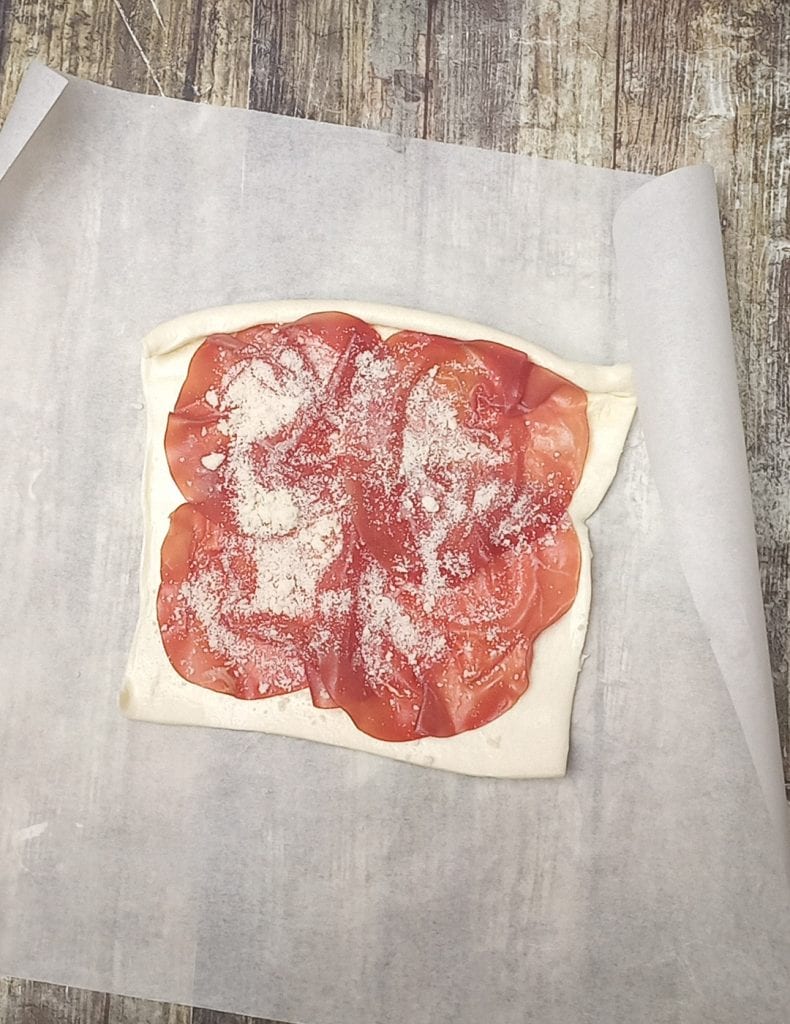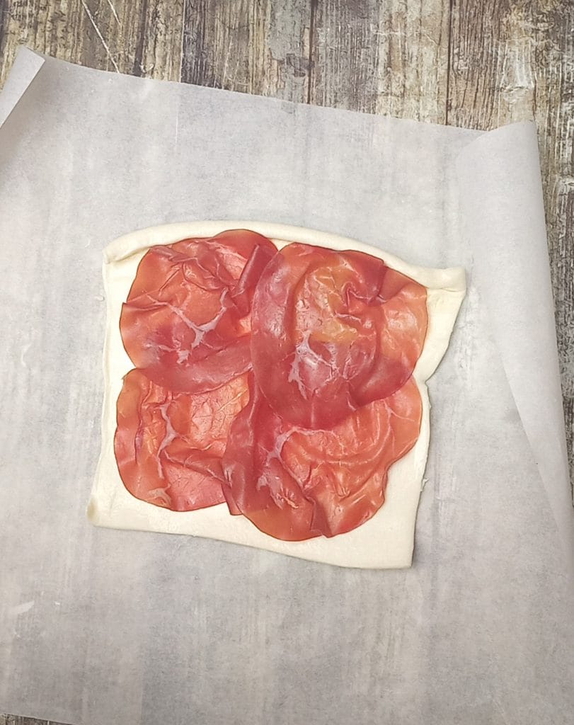 • Begin met het vullen van de rol door de plakjes bresaola naast elkaar te leggen en ze lichtjes te overlappen.