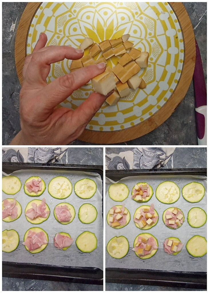Leg op de basis van de courgetteplakjes een paar stukjes gekookte ham en een paar blokjes gerookte scamorza.