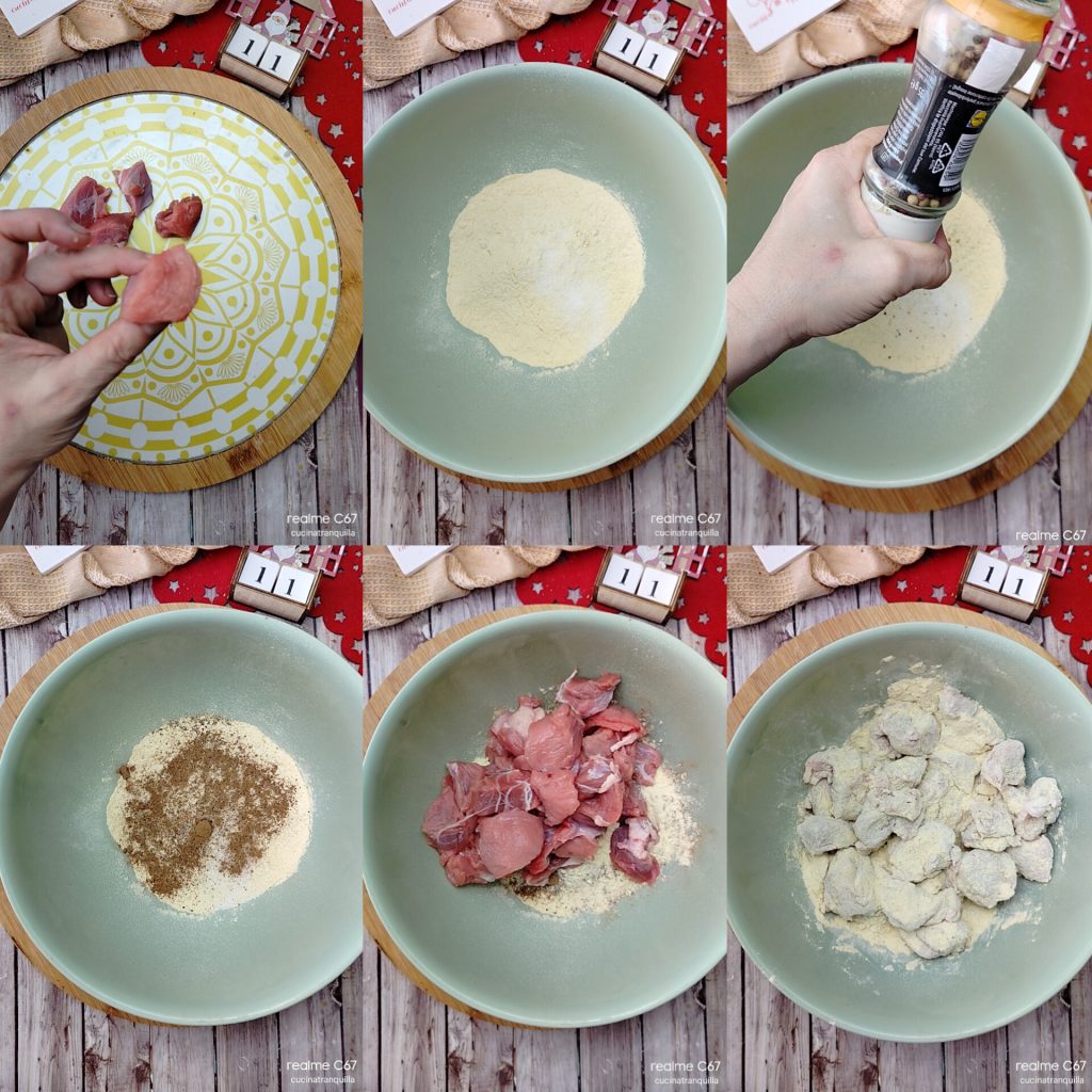 Ondertussen kun je je bezighouden met het vlees. Voeg in een kom het griesmeel, zout, peper en nootmuskaat toe en voeg de stukjes vlees toe. Meng goed om de ingrediënten goed te mengen.