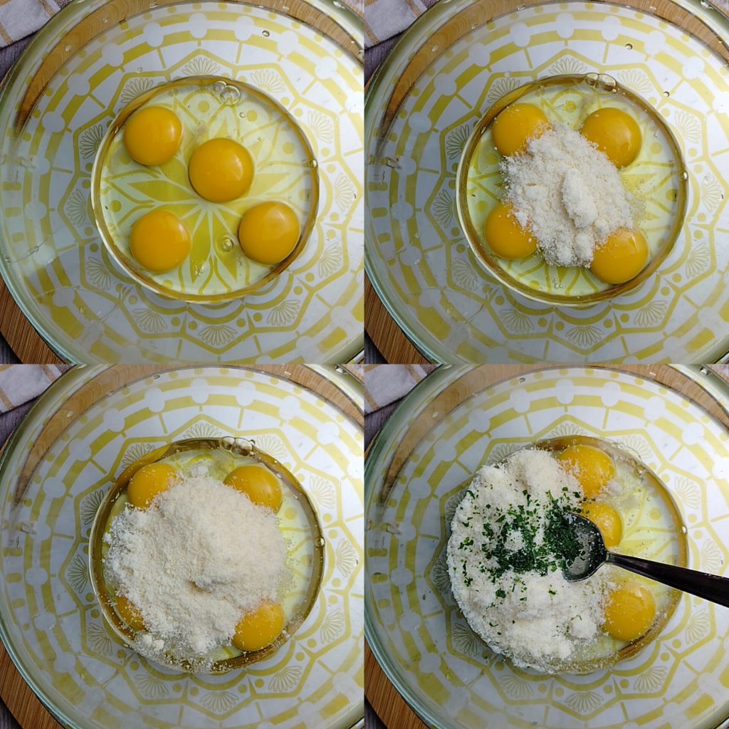 Meng in een ruime kom de eieren met 60 g geraspte kaas, het zout en de fijngehakte peterselie.