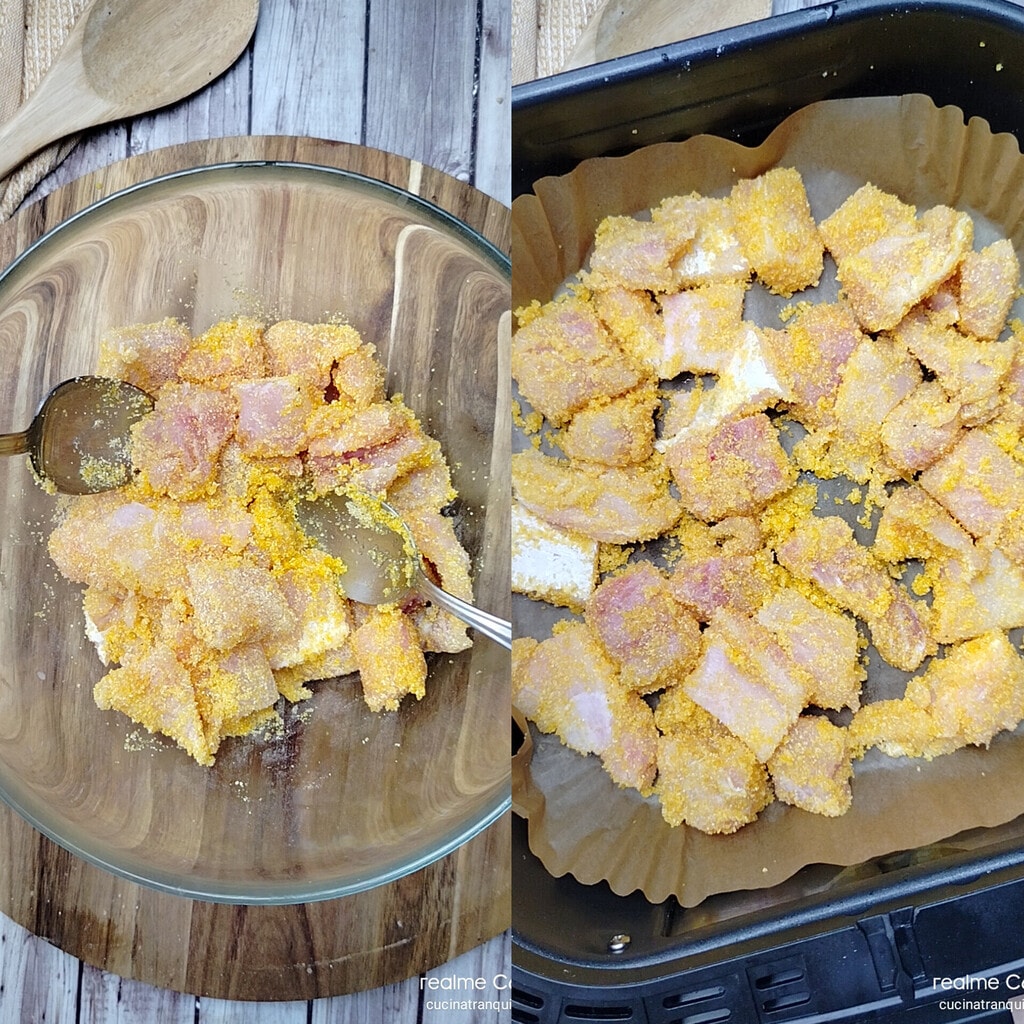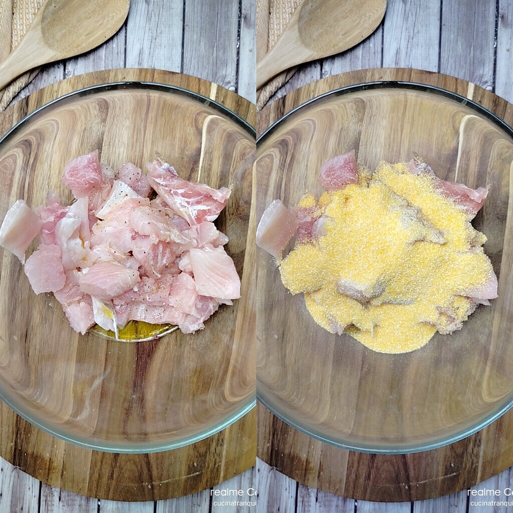 Doe de gesneden stukjes snoekbaars in een ruime kom. Voeg de extra vergine olijfolie toe, de peper, bij voorkeur versgemalen, het fijne zout en het paneermeel. Ik gebruikte de gele, gearomatiseerd met kurkuma, maar je kunt elke paneermeel naar voorkeur gebruiken.