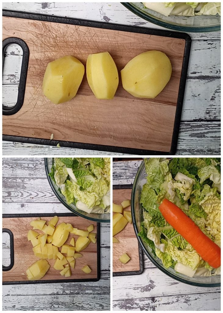 Schil de aardappelen en de wortel en snijd ze in kleine blokjes. Doe hetzelfde met de ui.