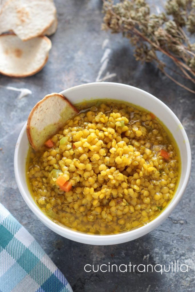 Soep van gele linzen en kurkuma, een perfect hoofdgerecht ook op koude herfstavonden, zeer snel en eenvoudig te maken. Ik vond gele linzen die klaar zijn in 20 minuten kooktijd, dus mijn recept is echt snel voor een soep, maar hou altijd rekening met de kooktijd die aangegeven staat op de verpakking. Maar wat zijn gele linzen? Het zijn gepelde linzen, een bron van plantaardige eiwitten en vezels, rijk aan kalium en ijzer. Ze zijn energiek en laag in calorieën, geschikt voor glycemische controle. Wat betreft mijn recept, u kunt deze soep genieten met croutons of kleine pasta zoals buisvormige of geribbelde ditalini. Hieronder laat ik enkele voorstellen om linzen te gebruiken, terwijl ik aan het einde van het recept de meest gestelde vragen beantwoord.
