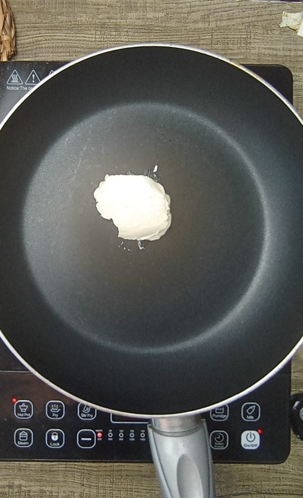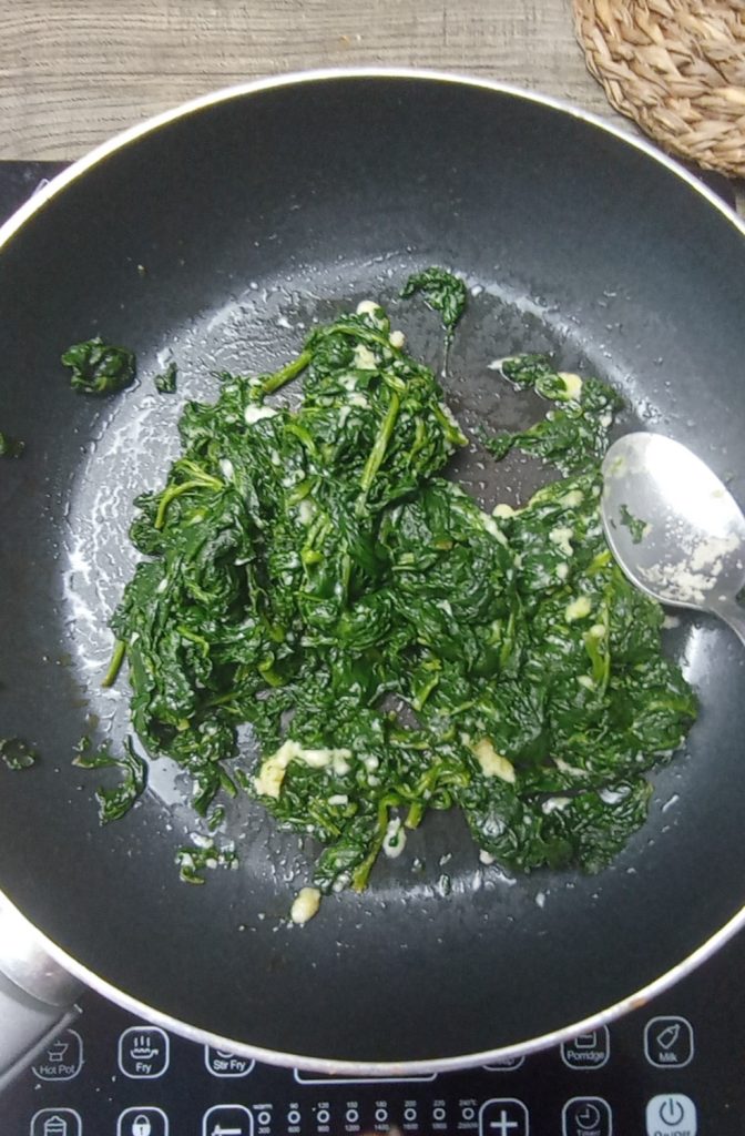 Ik heb de voorverpakte, gewassen en schoongemaakte spinazie gebruikt, zet ze in een ruime pan met 100 ml water en laat ze op laag vuur ongeveer 5-6 minuten slinken. Je kunt ze ook afdekken met een deksel en af en toe omroeren.