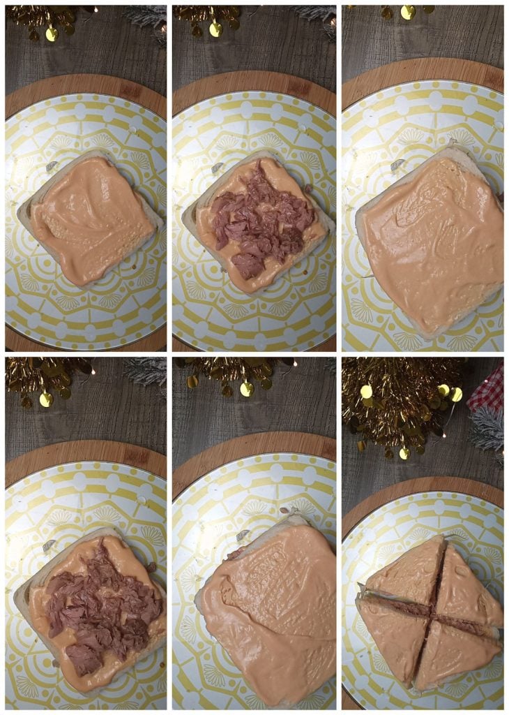 Voor de roze sandwiches met tonijn, bestrijk eerst het eerste sneetje met een laagje cocktailsaus, beleg het met de helft van de uitgelekte tonijn, dek af met een tweede sneetje brood en leg de resterende tonijn erop.