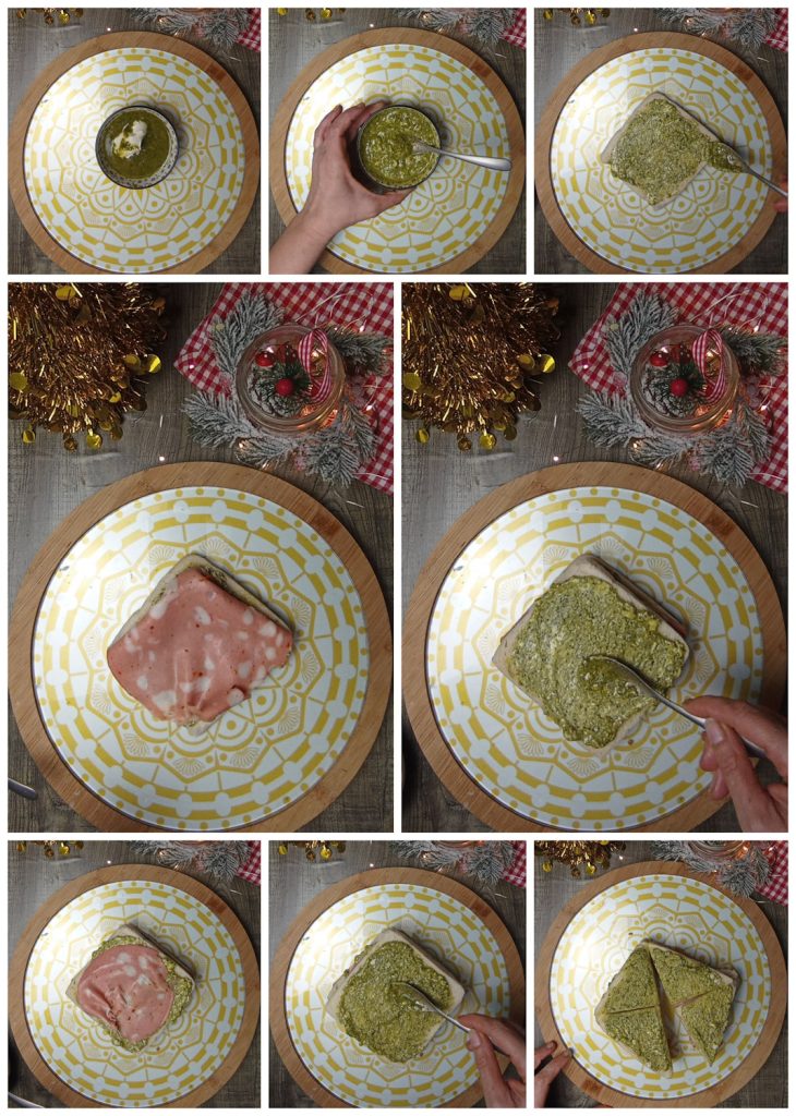 Om de stervormige sandwichtaart voor Oud en Nieuw te maken, meng allereerst de pesto met de romige smeerkaas, die we zullen nemen van een deel van de gebruikte smeerkaas voor de walnootsaus.